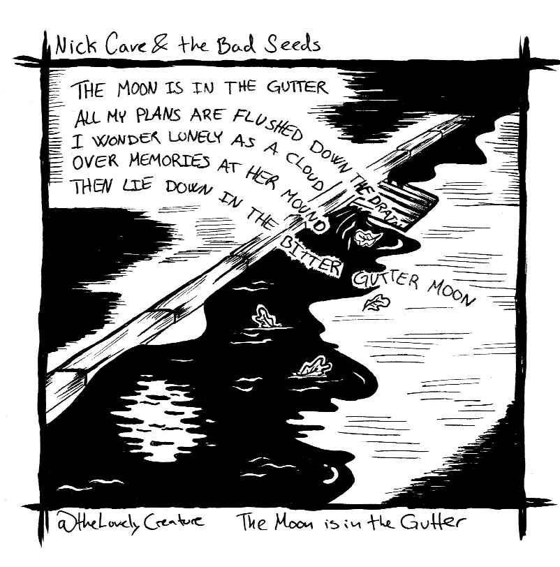 Nick Cave and the Bad Seeds Inktober day day 19. Inspired by the song The Moon is in the Gutter by Nick Cave and the Bad Seeds. Skrevet den januar 22, 2018januar 22, 2018